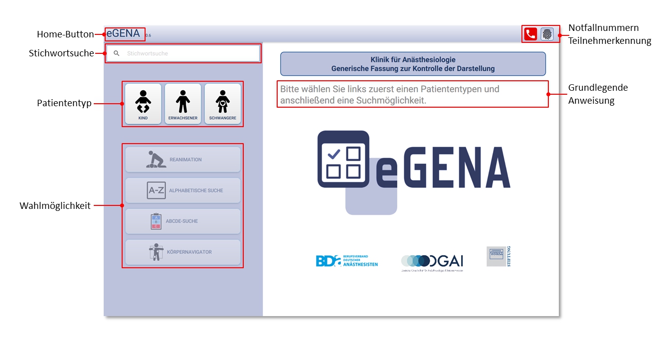 Die Startseite von eGENA ist dreigeteilt (Abb.2): Links befindet sich der Suchbereich mit verscheidenen Suchoptionen, rechts grundlegende Anweisungen zur Bedienung, Logos und, sofern editiert, der Name der Klinik. Oben quer verlaufend befindet sich die Kopfleiste, welche links den „eGENA“ Home-Button enthält. Dieser setzt die Anwendung auf die leere Startseite zurück. Rechts befinden sich die Icons mit den lokalen Notfallnummern und dem Dialog zur Eingabe der klinikspezifischen Teilnehmerkennung (‚Fingerabdruck‘).